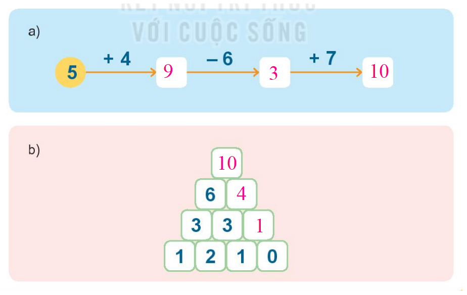 b) Tính nhẩm kết quả phép cộng hai số cạnh nhau ta được số ở hàng trên xem giữa hai số đó.