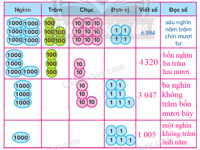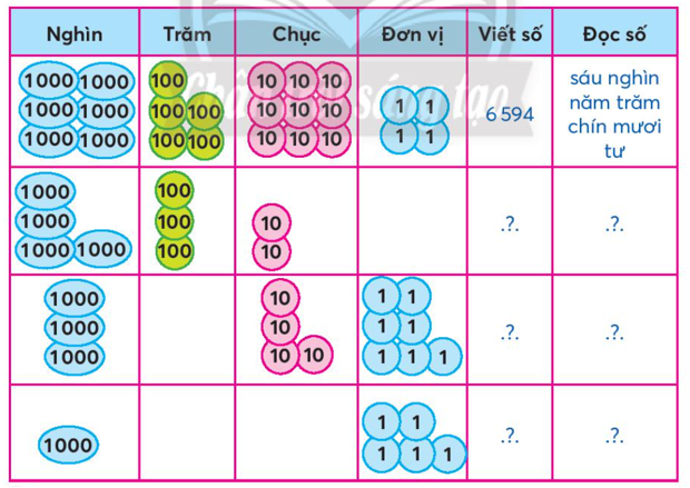 Đếm thẻ số ở mỗi ô để tìm số nghìn, số trăm, số chục, số đơn vị rồi viết và đọc theo mẫu.