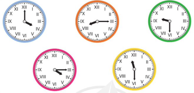Dựa vào cách đọc các chữu số La Mã, em xác định thời gian trên mỗi đồng hồ.