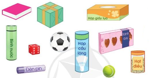- Đồ vật dạng khối trụ: Bình nước, hộp cầu lông, hộp hạt điều, đèn pin
