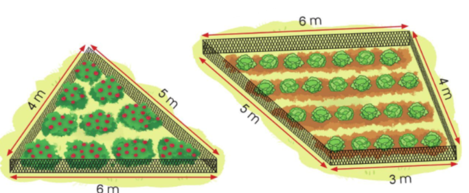 Bác Sáu dùng lưới để rào hai mảnh vườn trồng hoa và trồng rau như hình dưới đây. Theo em, bác Sáu cần dùng bao nhiêu mét lưới để rào mảnh vườn trồng hoa, bao nhiêu mét lưới để rào mảnh vườn trồng rau?
