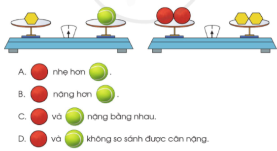Vậy cân nặng của vật màu đỏ và vật màu xanh bằng nhau. (Vì cùng bằng cân nặng của vật màu vàng)