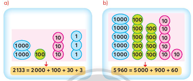Dựa vào cách viết số thành tổng các nghìn, trăm, chục và đơn vị, em quan sát tranh rồi xác định các câu đúng, câu sai.