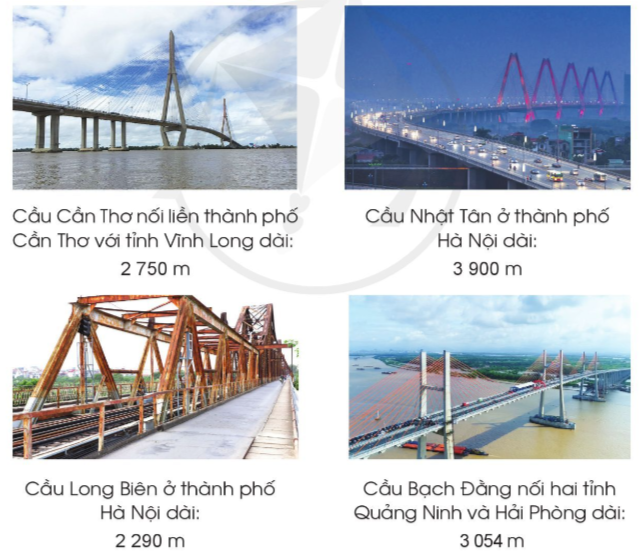 Tên các cây cầu đó theo thứ tự từ ngắn nhất đến dài nhất là Cầu Long Biên, Cầu Cần Thơ, Cầu Bạch Đằng, Cầu Nhật Tân.