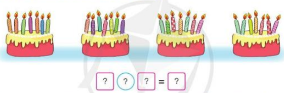 Em đếm số cây nến trên mỗi chiếc bánh và số chiếc bánh trong hình. Từ đó viết phép nhân thích hợp.