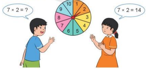 Tính nhẩm. Nêu phép nhân thích hợp với tranh vẽ. Quay kim trên vòng tròn để chọn một số bất kì.