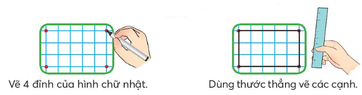 - Hình chữ nhật có 4 góc vuông; 2 cạnh dài có độ dài bằng nhau; 2 cạnh ngắn có độ dài bằng nhau.