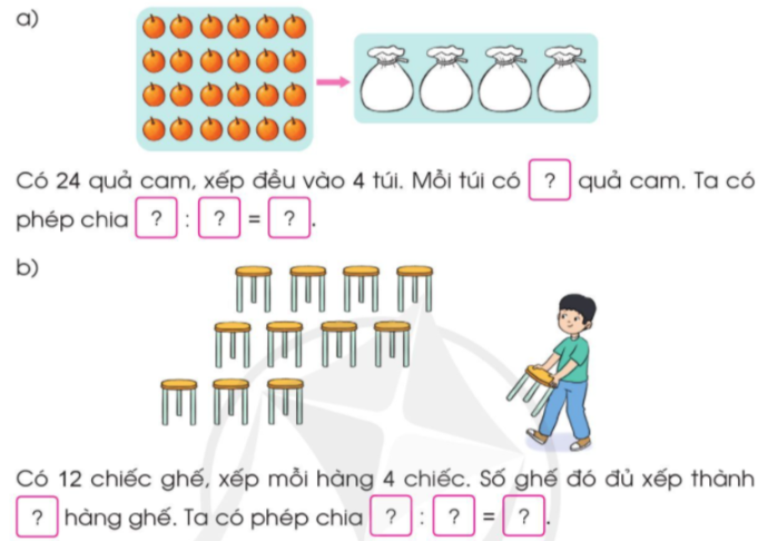 a) Có 24 quả cam, xếp đều vào 4 túi. Mỗi túi có 6 quả cam. Ta có phép chia 24 : 4 = 6