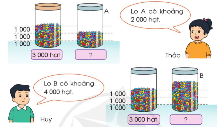 a) Bạn Thảo và Huy ước lượng số hạt trọng lọ dựa vào việc quan sát lọ bên cạnh đã biết số hạt và chia thành các phần bằng nhau.