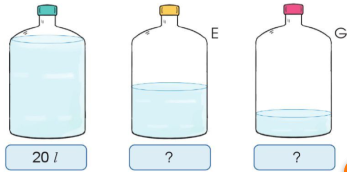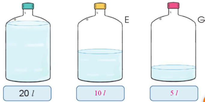 Lượng nước trong bình G bằng lượng nước trong bình E giảm đi 2 lần nên bình G có khoảng 10 : 2 = 5 lít.