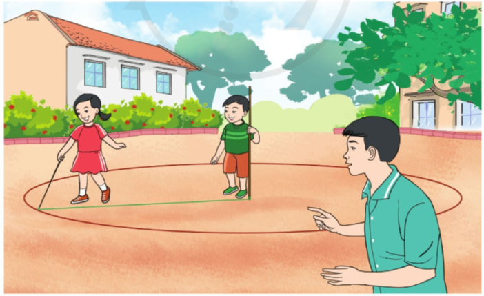 1 bạn học sinh đứng cố định ở một đầu dây, một bạn khác kéo căng cây và xoay chiếc cọc còn lại 1 vòng tạo thành một hình tròn.