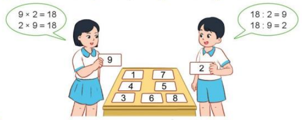 Em chọn 2 thẻ số trong các thẻ ghi các số từ 1 đến 9 rồi nêu phép nhân và phép chia tương ứng cho các thẻ số đó.
