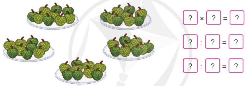 Đếm số quả na ở mỗi đĩa và số đĩa trong hình từ đó viết các phép nhân, phép chia thích hợp vào ô trống.