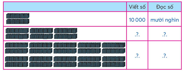 Viết và đọc các số tròn chục nghìn trong bảng dưới đây. Lấy các thẻ 10 000, 1 000, 100, 10, 1 phù hợp với mỗi bảng sau