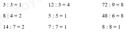 Những phép chia có kết quả bằng 1 là 3 : 3 ; 5 : 5 ; 7 : 7 ; 8 : 8