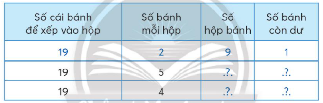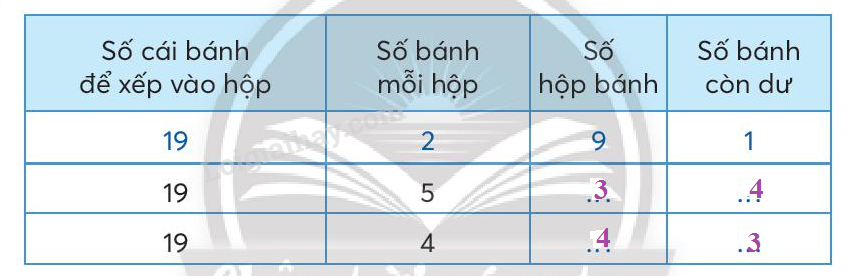 Muốn tìm số hộp bánh ta lấy số cái bánh để xếp vào hộp chia cho số bánh mỗi hộp.