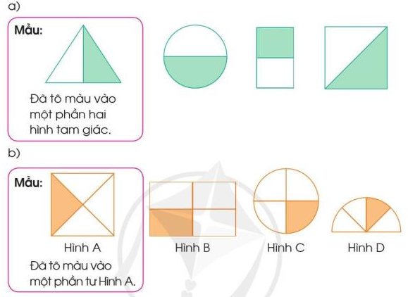 Bước 1: Đếm số phần bằng nhau ở mỗi hình và số phần được tô màu.