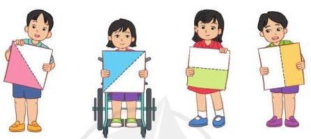 Em gấp tờ giấy và tô màu theo hướng dẫn của đề bài để được $\frac{1}{2}$và $\frac{1}{4}$ tờ giấy.
