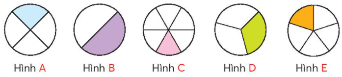Bước 1: Đếm số phần bằng nhau ở mỗi hình và số phần được tô màu.
