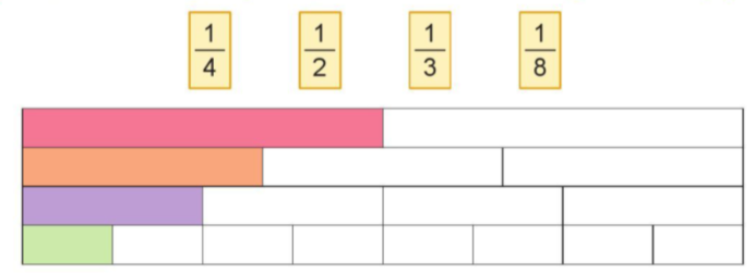 Bước 1: Đếm số phần bằng nhau và số phần được tô màu trên mỗi băng giấy màu.