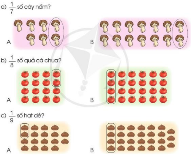 a) Hình A có 7 cây nấm. $\frac{1}{7}$Số cây nấm ở hình A là 7 : 7 = 1 (cây)