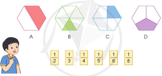 Chọn thẻ tương ứng với phần đã tô màu trong mỗi hình sau: