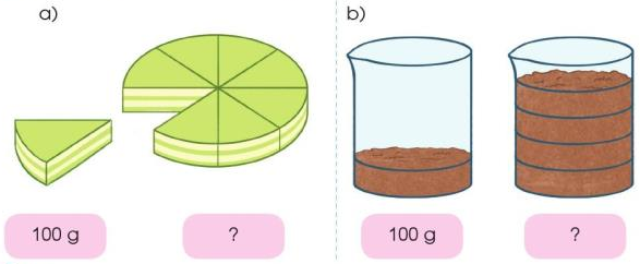 b) Chiếc cốc đựng 4 phần bột bằng nhau. Mỗi phần nặng 100 g.