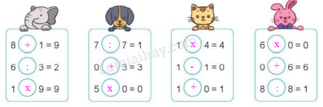 Chọn dấu (+, - , x , :) thích hợp.