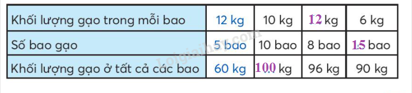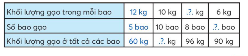 - Khối lượng gạo trong mỗi bao = Khối lượng gạo ở tất cả các bao : số bao