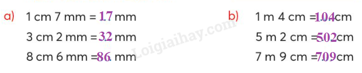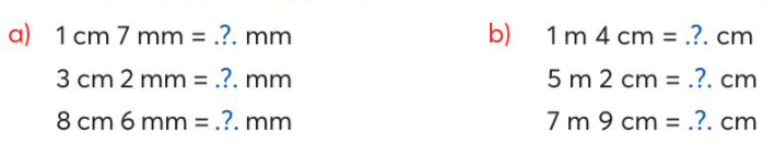 Áp dụng cách đổi 1 cm = 10 mm ; 1 m = 100 cm