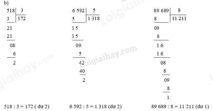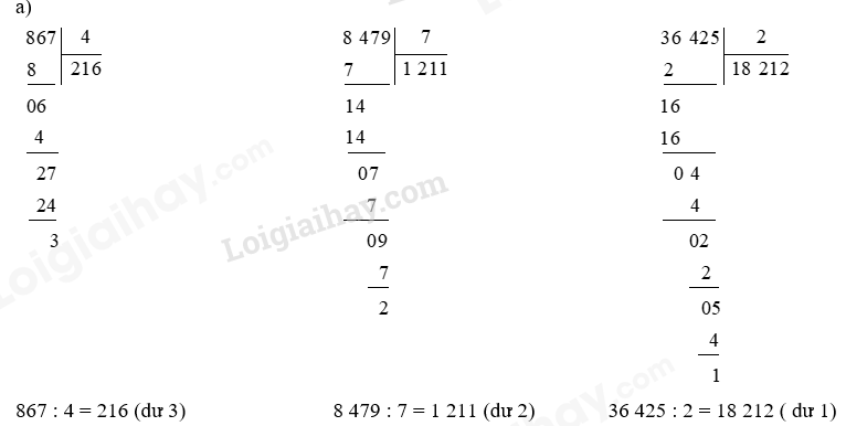 Tính rồi nêu thương và số dư trong mỗi phép chia sau: