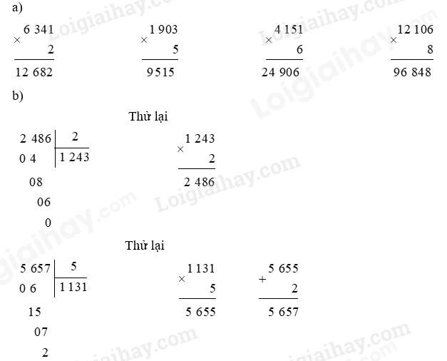 b) Thực hiện các phép chia rồi dùng phép nhân để thử lại: