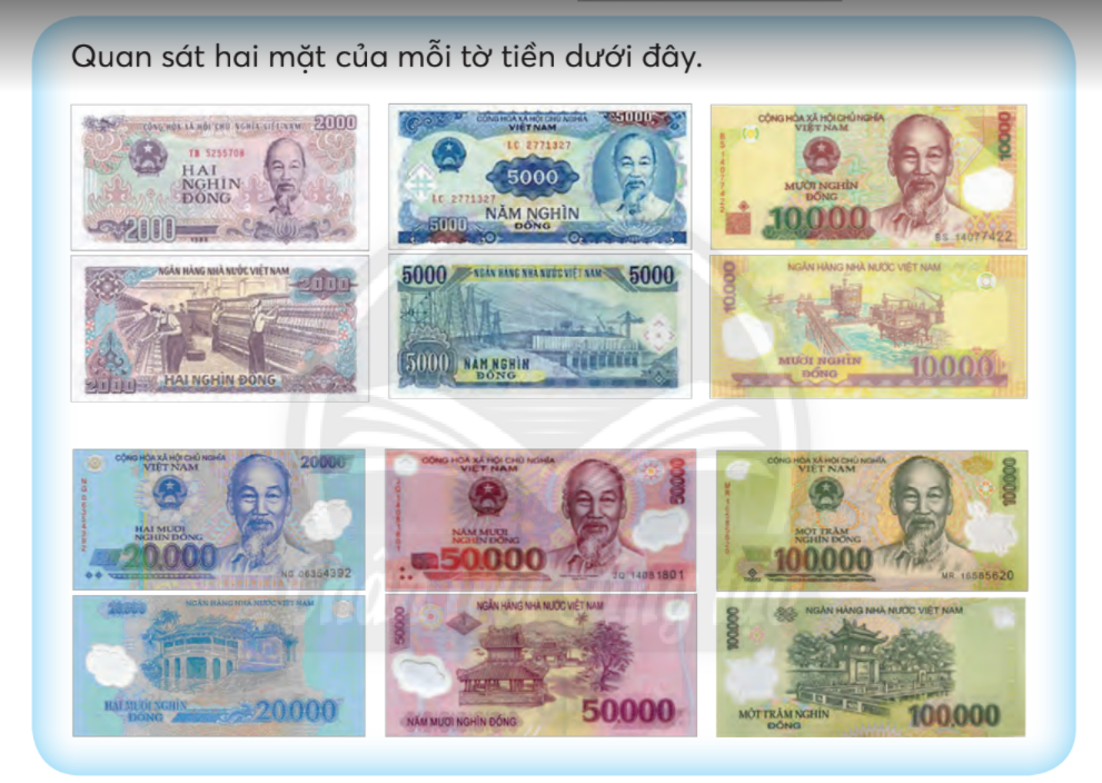 Đọc số ghi trên mỗi tờ tiền trên để biết mệnh giá của các tờ tiền.