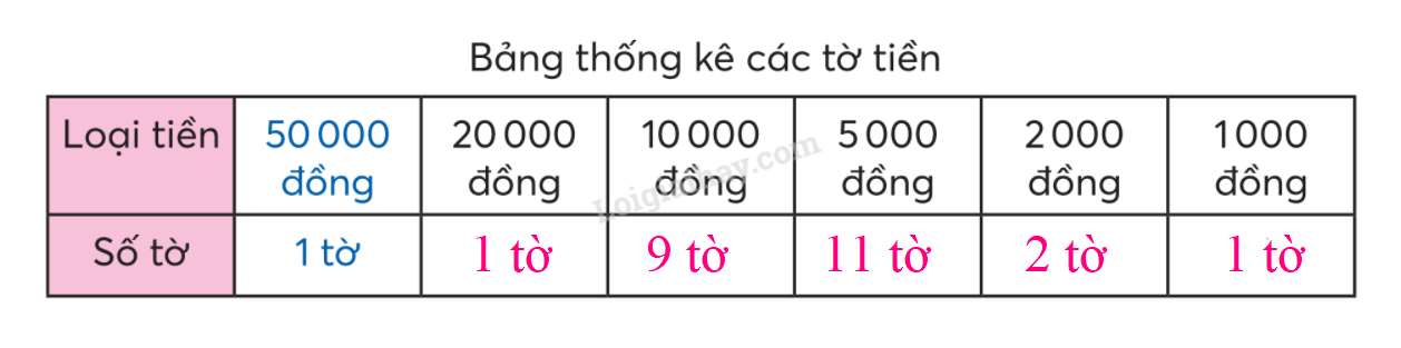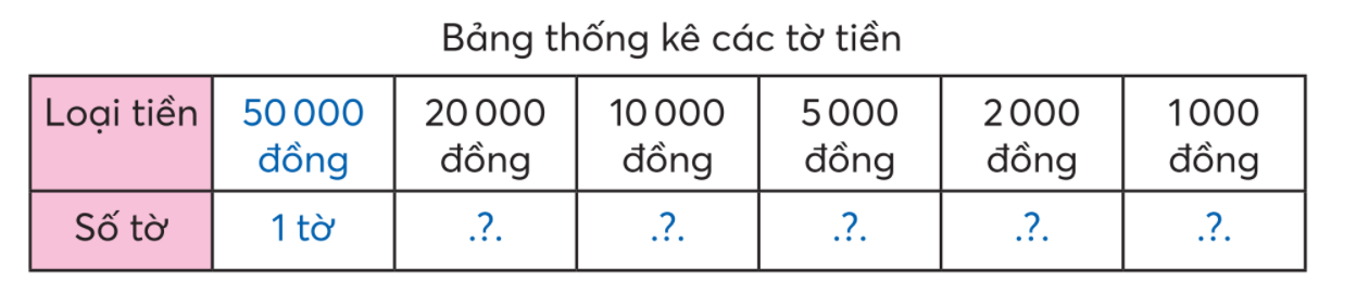 Đếm số lượng các tờ tiền có trong bài 3 rồi điền số thích hợp để hoàn thiện bảng thống kê các tờ tiền.