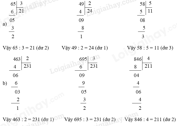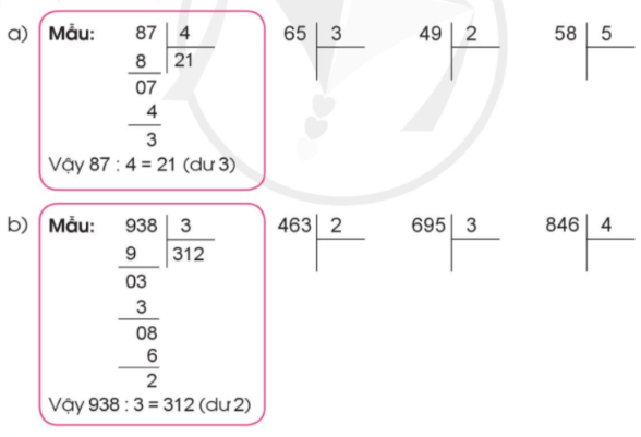 Em đặt tính rồi thực hiện chia theo thứ tự từ trái sang phải.