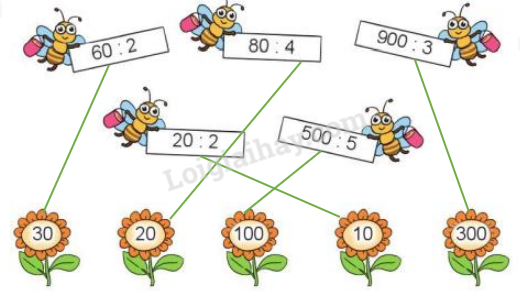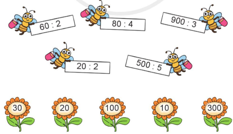 Thực hiện phép chia rồi nối với bông hoa ghi kết quả tương ứng.