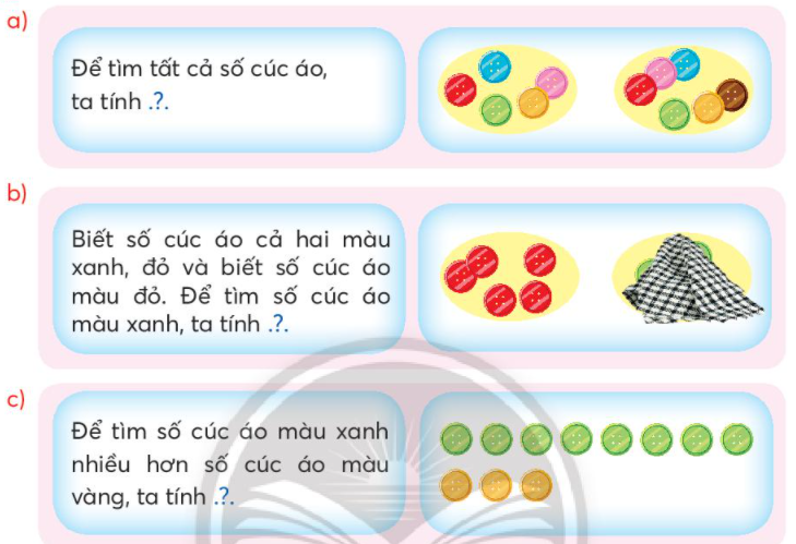 b, Biết số cúc áo cả hai màu xanh, đỏ và biết số cúc áo màu đỏ. Để tìm số cúc áo màu xanh, ta tính hiệu.