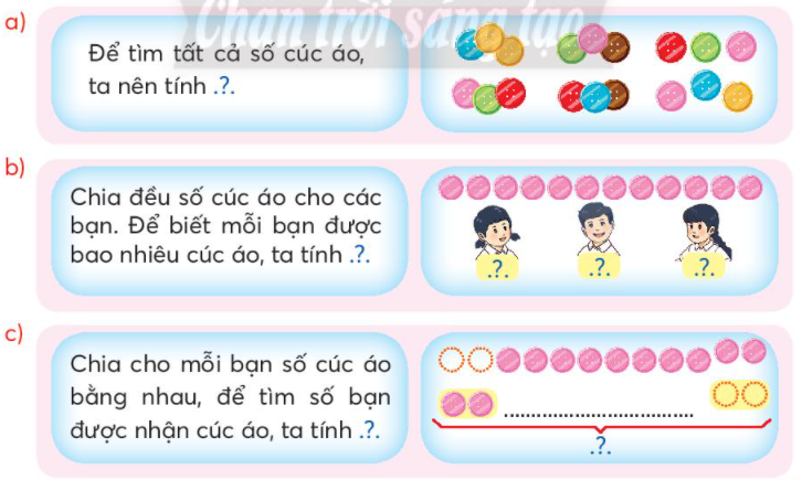 b) Chia đều số cúc áo cho các bạn, Để biết mỗi bạn được bao nhiêu cúc áo, ta tính thương.