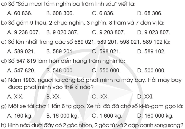g) Một xe tải chở 1 tấn 6 tạ gạo. Xe tải đó đã chở số ki-lô-gam gạo là 1 600 kg