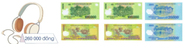 b) Hà mua một chiếc tai nghe với giá 260 000 đồng. Quan sát các tờ tiền Hà đưa cho cô bán hàng. Theo em, Hà đã trả đủ tiền chưa?