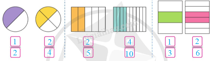 b) Quan sát hình vẽ để viết phân số bằng với phân số còn lại trong mỗi cặp hình.