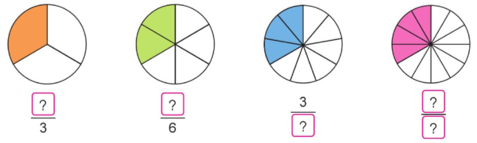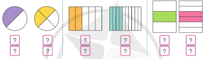 Viết số thích hợp vào ô trống để tạo thành phân số chỉ số phần được tô màu.