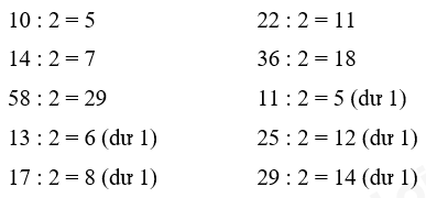 Vậy các phép chia hết là: 10 : 2 , 22 : 2 , 14 : 2 , 36 : 2 , 58 : 2
