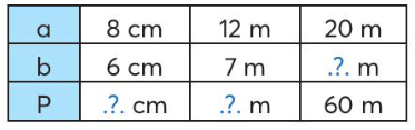 - Nếu a = 12 m, b = 7 m thì P = (a + b) x 2 = (12 + 7) x 2 = 38 (m)