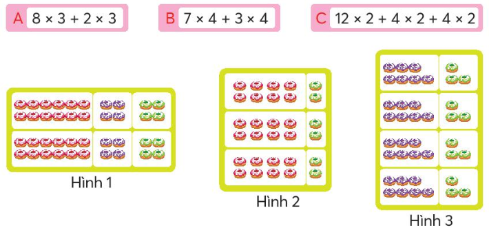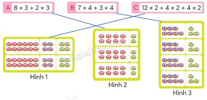 b) Dưới đây là các biểu thức thể hiện cách tính số cái bánh ở mỗi hình. Chọn hình ảnh phù hợp với biểu thức.