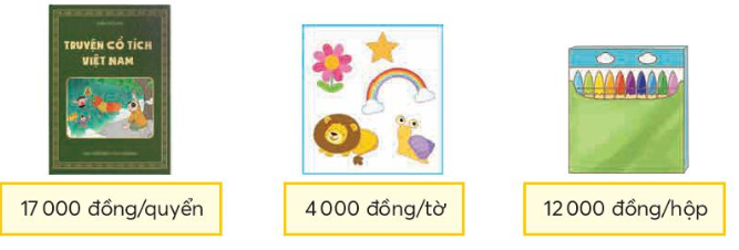 An mua 3 phần quà cho lớp. Mỗi phần quà gồm 1 quyển truyện, 1 tờ miếng dán hình và 1 hộp bút chì màu (giá tiền như dưới đây).