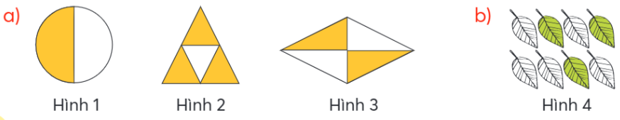 Viết rồi đọc các phân số chỉ phần đã tô mỗi màu trong mỗi hình. Với mỗi phân số, mẫu số cho biết gì, tử số chỉ gì?