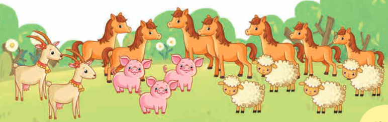 Những con vật trong tranh gồm bốn loại: dê, lợn, cừu và ngựa. Nêu phân số chỉ số con vật mỗi loại trong bức tranh (theo mẫu).