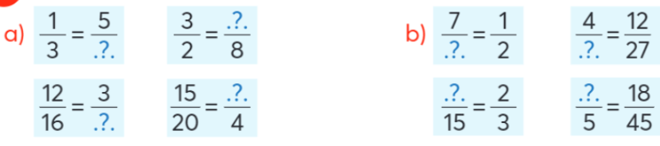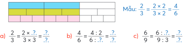 Vậy $\frac{2}{3} = \frac{6}{9}$ ; $\frac{3}{4} = \frac{9}{{12}}$
