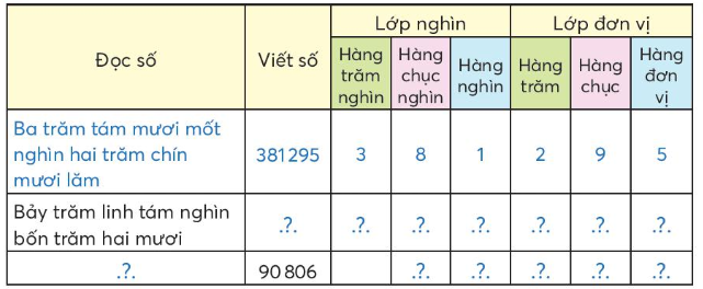 Viết số lần lượt từ hàng trăm nghìn, hàng chục nghìn, hàng nghìn, hàng trăm, hàng chục, hàng đơn vị
